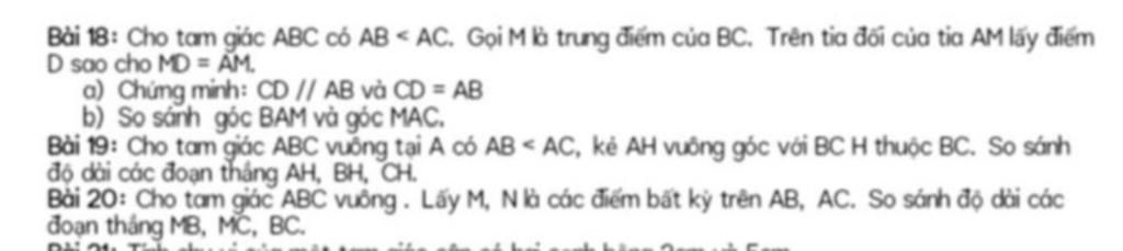 Bài 18: Cho tam giác ABC có AB < AC. Gọi M là trung điểm của BC. Trên tia đối của tia AM lấy điểm
