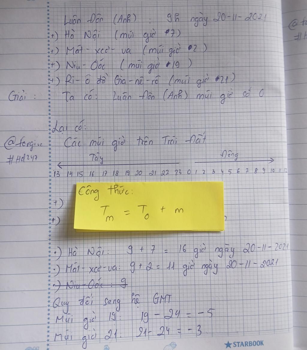 Khi ở Luân Đôn (Anh) là 9 giờ ngày 20 - 11 - 2021 thì cùng lúc đó ở các thành phố Hà Nội (múi số 7), Mát-xcơ-va (múi số 2), Niu Oóc (múi số 19), Ri-ô đề Gia-nê-rô (múi số 21) là mấy giờ, ngày nào?