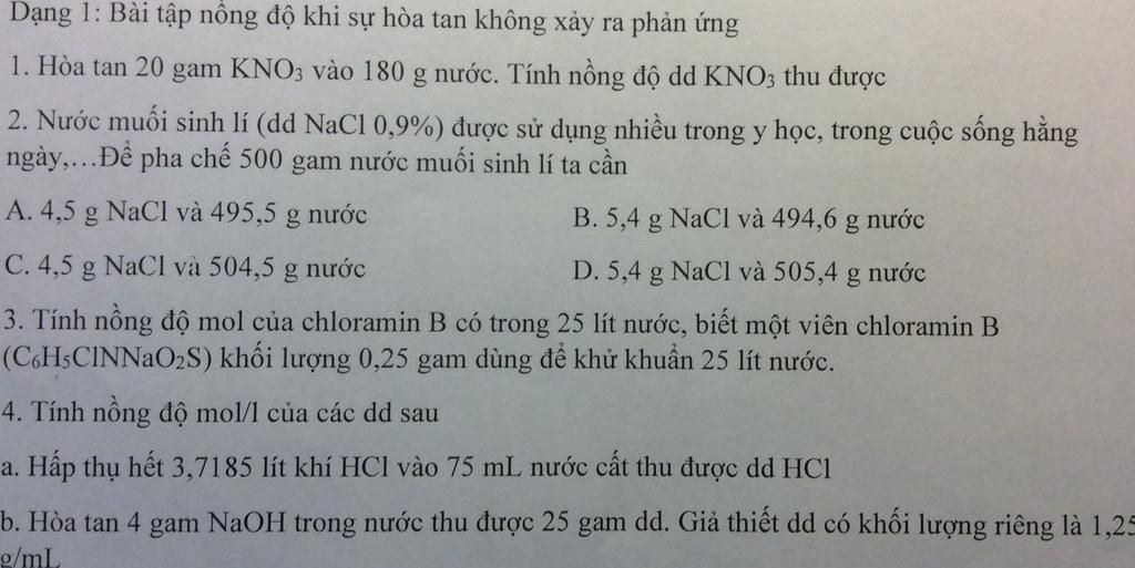 `+` A. `C% = m_(NaCl)/m_text{dd} * 100% = (4,5)/(4,5 + 495,5) * 100% = 0,009%` ( Không thỏa mãn yêu cầu đề bài )