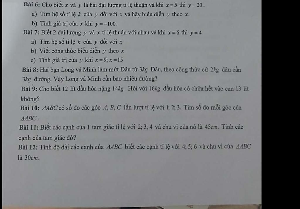 Bài 6: Cho biết x và y là hai đại lượng tỉ lệ thuận và khi x=5 thì y= 20.