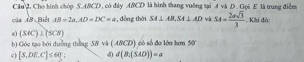 & \text{b) Xét mệnh đề: Góc tạo bởi đường thẳng } SB \text{ và } (ABCD) \text{ có số đo lớn hơn } 50^\circ \\