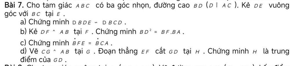 Bài 7. Cho tam giác ABC có ba góc nhọn, đường cao BD (D 1 AC ). Kẻ DE vuông