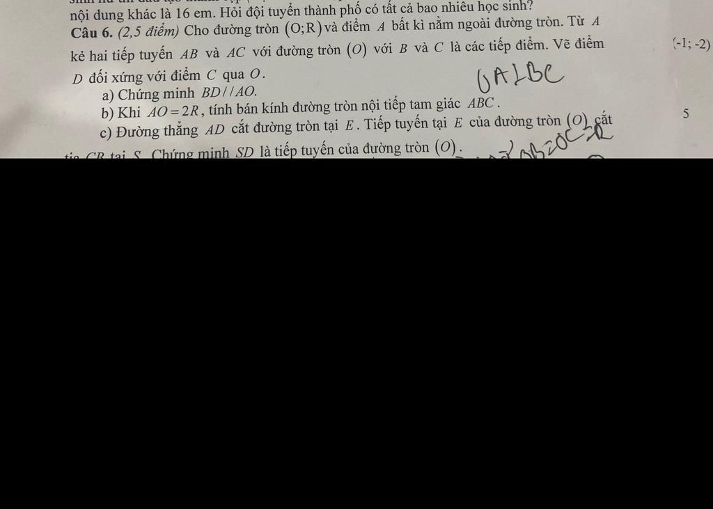 Câu 6. (2,5 điểm) Cho đường tròn (O;R) và điểm 4 bất kì nằm ngoài đường tròn. Từ A
