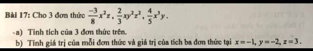 Giá trị của tích ba đơn thức tại `x = -1, y = -2, z = 3` là: