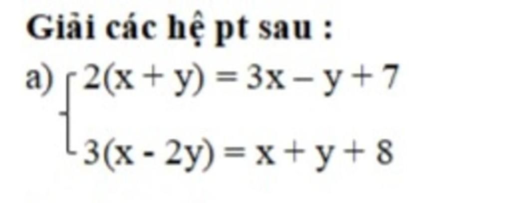 `a)` `{(2(x+y) = 3x - y + 7), (3(x-2y) = x + y + 8):}`