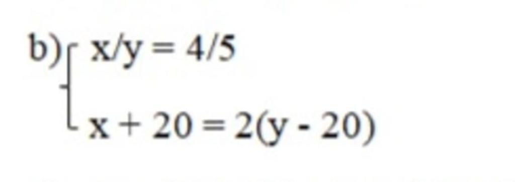 `b)` `{(x/y = 4/5), (x + 20 = 2(y - 20)):}`