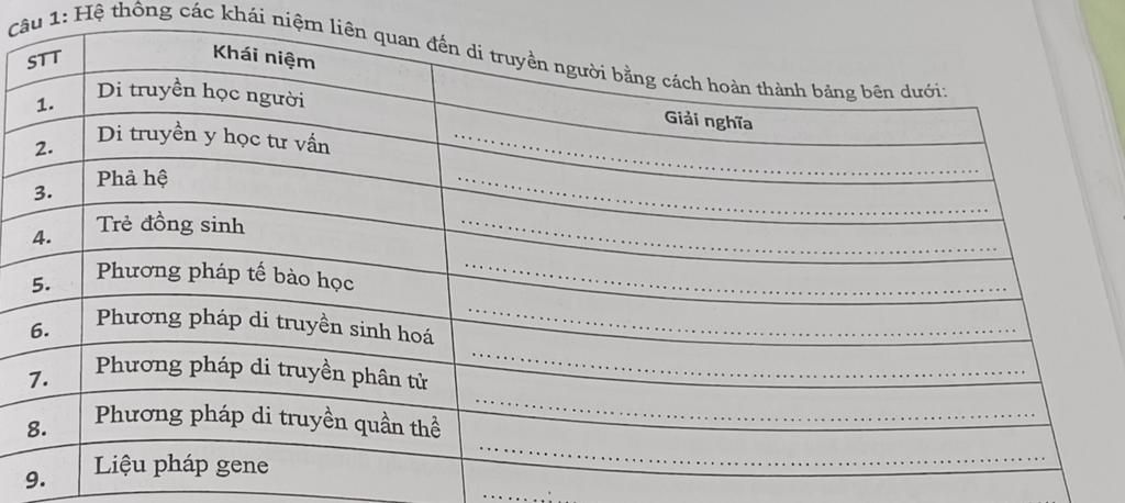 Câu 1: Hệ thông các khái niệm liên quan đến di truyền người bằng cách hoàn thành bảng bên dưới: