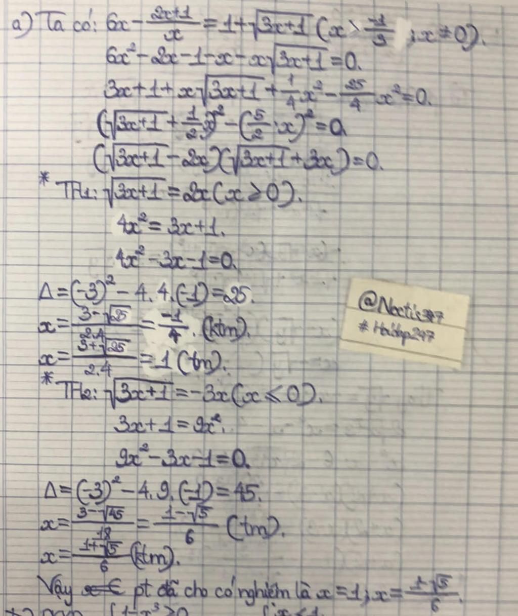 `a)` Giải phương trình: `6x - (2x+1)/x = 1 + \sqrt{3x+1}`