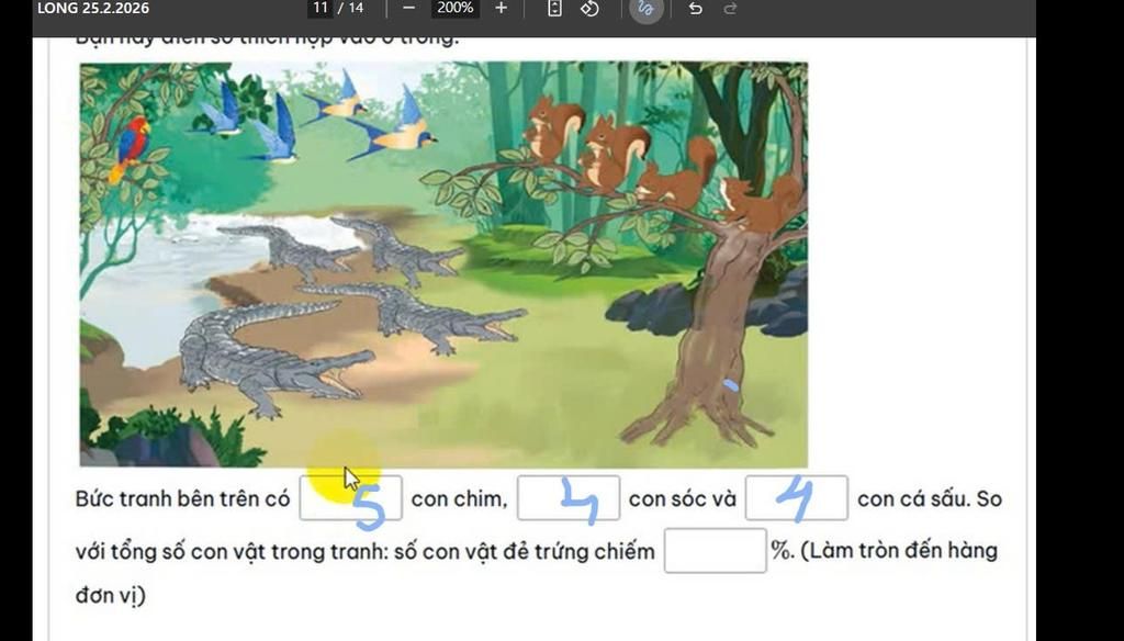 Vậy bức tranh bên trên có $\fbox{5}$ con chim, $\fbox{4}$ con sóc và $\fbox{4}$ con cá sấu. So với tổng số con vật trong tranh: số con vật đẻ trứng chiếm $\fbox{69%}$.