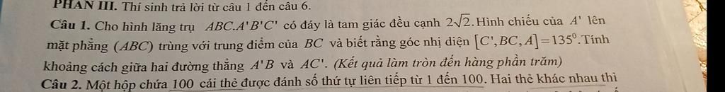 & \text{Kết quả: Khoảng cách giữa hai đường thẳng } A'B \text{ và } AC' \text{ bằng } 1,22
