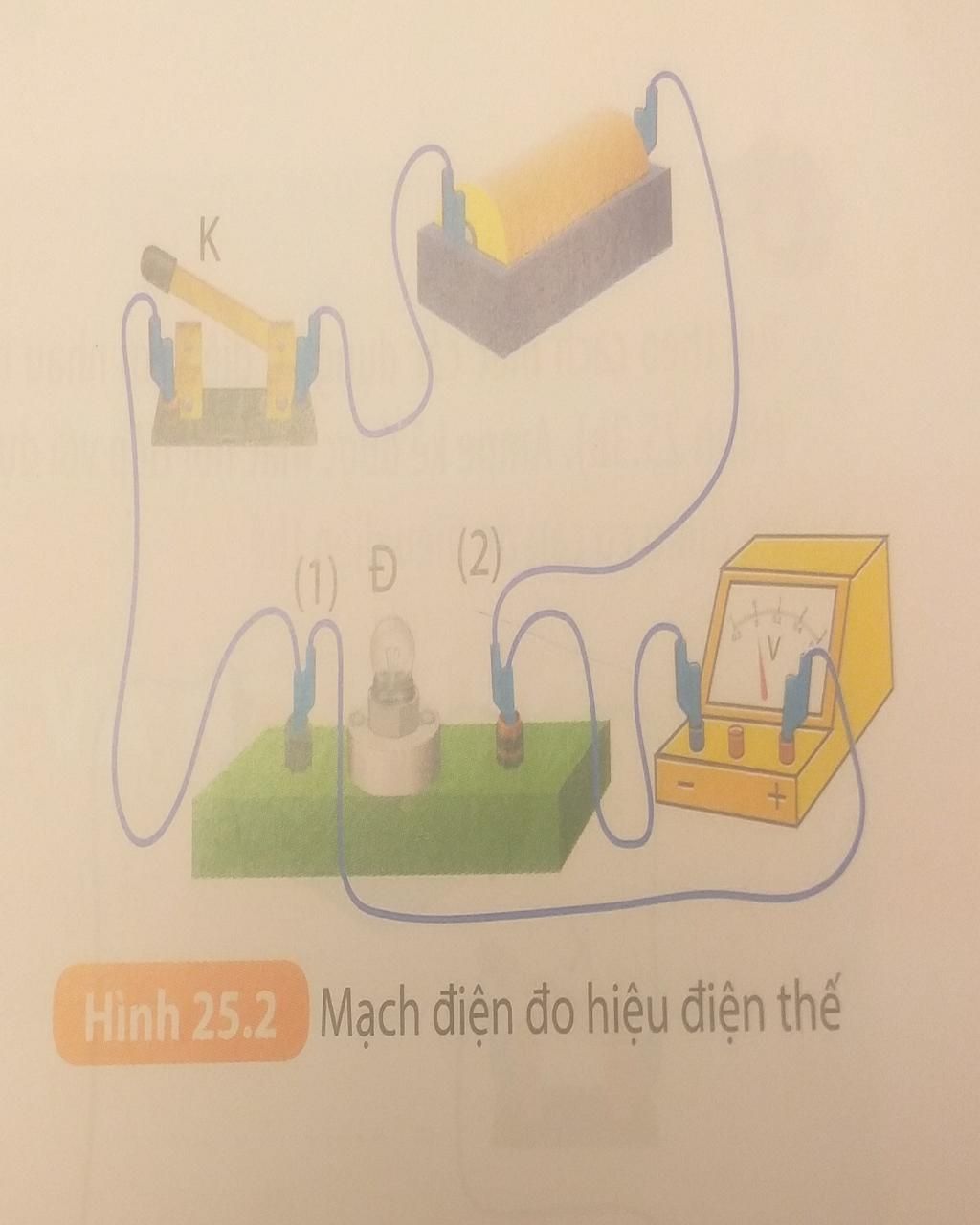 + Mạch điện có 1 nguồn, 1 khóa K mở, 1 đèn và 1 vôn kế (mắc song song với đèn) để đo hiệu điện thế của đèn.