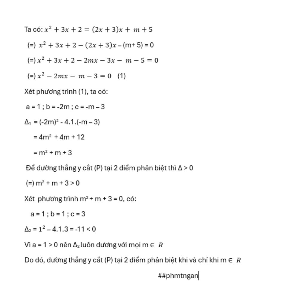 Tìm m để đường thẳng y=(2m+3)x+m+5 cắt (P) tại 2 điểm phân biệt