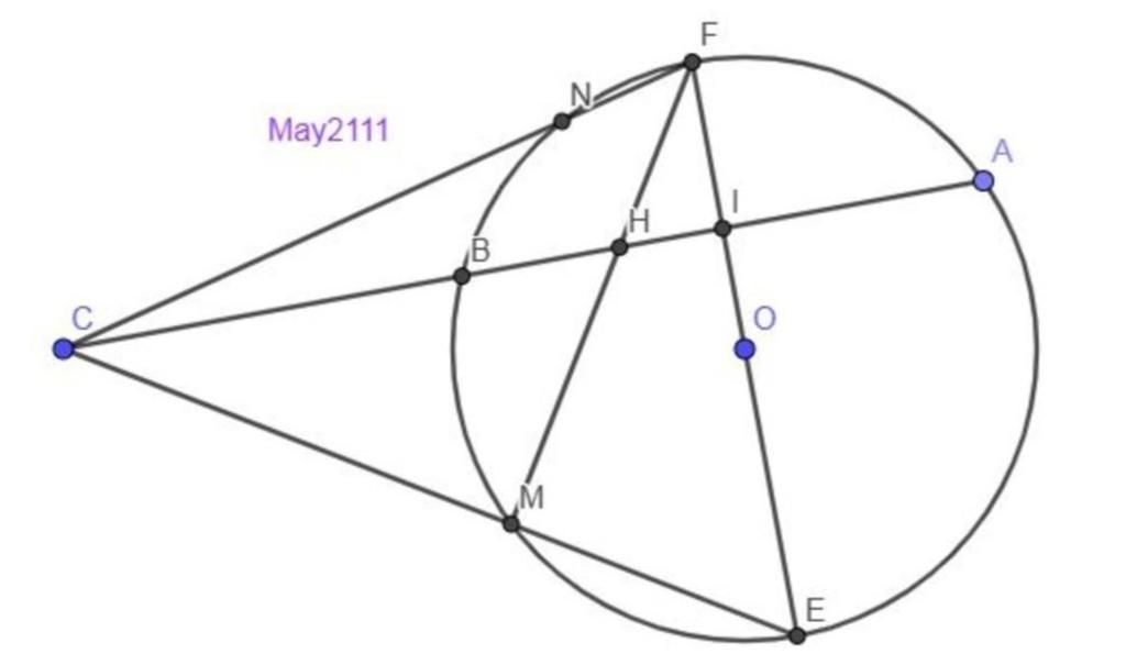 Cho đường tròn (O) và điểm C nằm ngoài đường tròn, từ điểm C kẻ dường thẳng cắt dường tròn (O) tại hai điểm A và B (điểm B năm giữa A và C). Kẻ đường kính EF vuông góc với dây AB tại I, CE và CF cắt (O) lần lượt tại M và N. FM cắt AB tại H. b. Chứng minh 3 điểm E, H, N thẳng hàng(theo hình dưới)