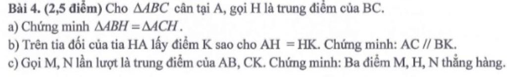 Vậy tam giác AMH = tam giác KNH ( c-g-c)
