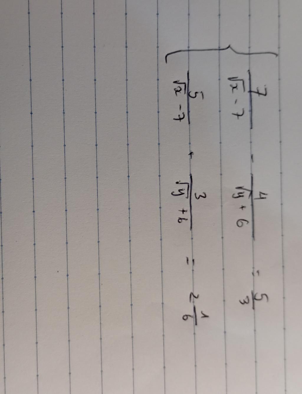 `{(7/(sqrt{x} - 7) - 4/(sqrt{x} + 6) = 5/3),(5/(sqrt{x} - 7) + 3/(sqrt{y}+6) = 13/6 ):}`