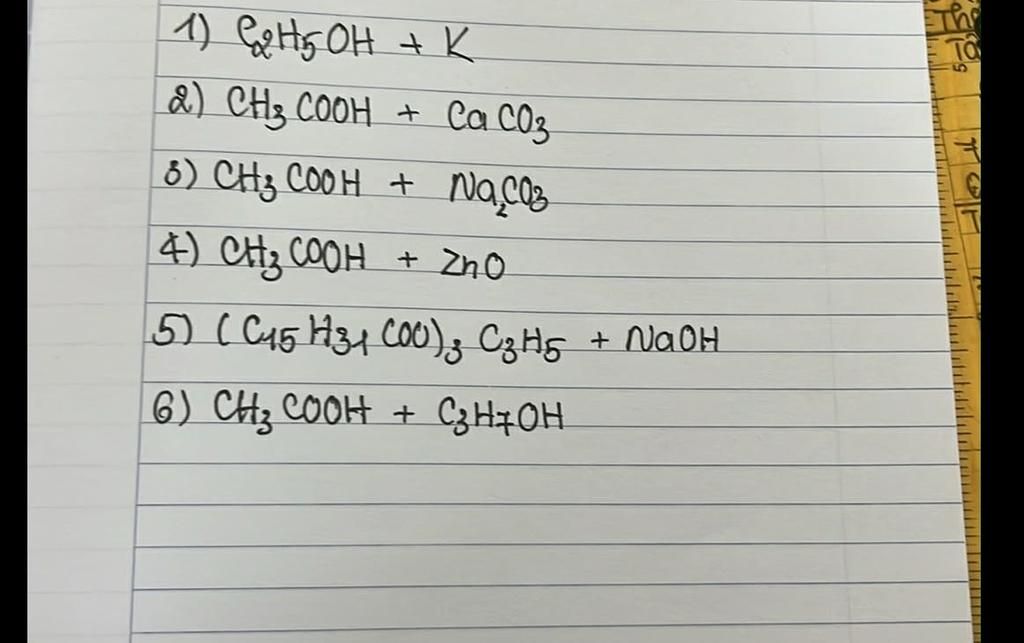 6) `CH_3COOH + C_3H_7OH` $\xrightarrow[`t^0`]{`H_2SO_4`}$ `CH_3COOC_3H_7 + H_2O`