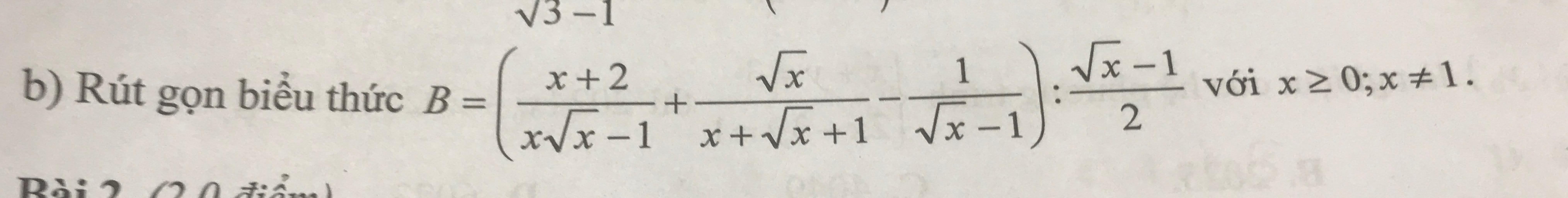 `B = ((x+2)/(xsqrt(x) - 1) + (sqrt(x))/(x+sqrt(x) + 1) - 1/(sqrt(x) - 1) : (sqrt(x) - 1)/2 (x >= 0, xne 1)`