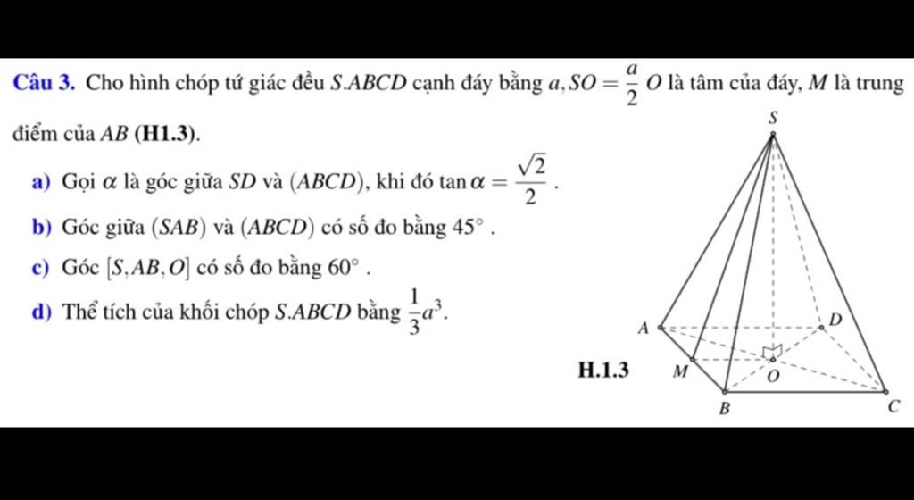 & \text{d) Thể tích của khối chóp } S.ABCD \text{ bằng } \dfrac{1}{3}a^3 \text{.} \\