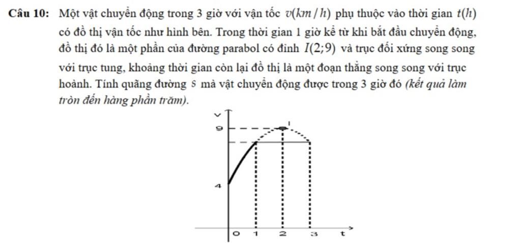 Vận tốc trên `[0;1]` `(`parabol đỉnh `I(2;9);` đi qua `(0;4))` là: