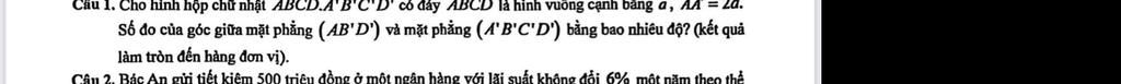 Do $ABCD.A'B'C'D'$ là hình hộp chữ nhật nên $BB' \bot (ABCD)$ tại $B$ và $DD' \bot (ABCD)$ tại $D$