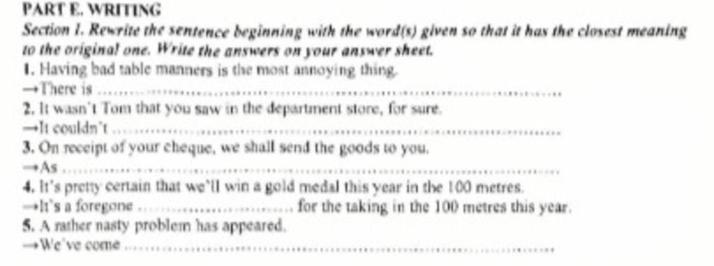 Section 1: Rewrite the sentence beginning with the word(s) given so that it has the closest meaning to the original one. Write the answers on your answer sheet.
