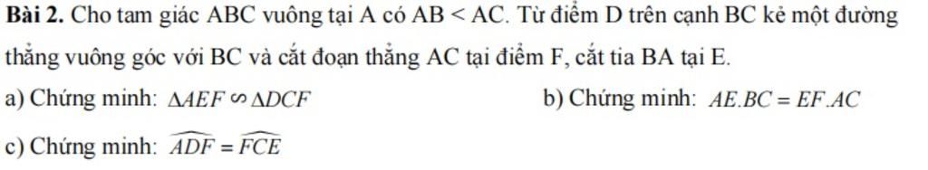 Bài 2. Cho tam giác ABC vuông tại A có AB < AC. Từ điểm D trên cạnh BC kẻ một đường