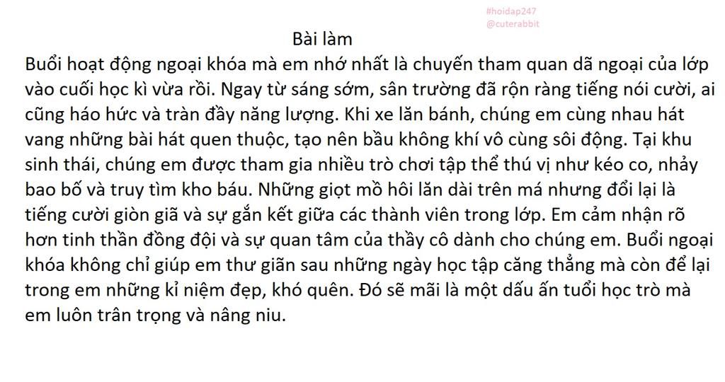 Viết đoạn văn thể hiện tình cảm, cảm xúc về một buổi hoạt động ngoại khoá của trường hoặc lớp em.