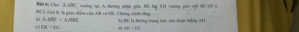 Bài 6: Cho A ABC vuông tại A, đường phân giác BE.Kẻ EH vuông góc với BC (H ∈