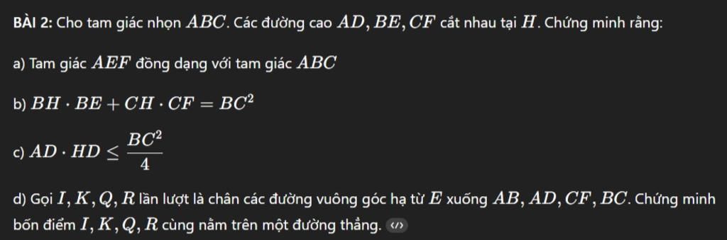 BÀI 2: Cho tam giác nhọn ABC. Các đường cao AD, BE, CF cắt nhau tại H. Chứng minh rằng:
