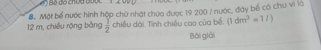 Đổi : `19200` l = `19200` dm$^3$ = `19,2` m$^3$