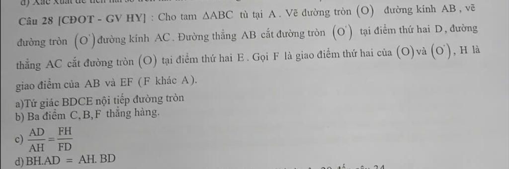 & \widehat{ADC} = 90^\circ \text{ (góc nội tiếp chắn nửa đường tròn (O')) hay } \widehat{BDC} = 90^\circ \\
