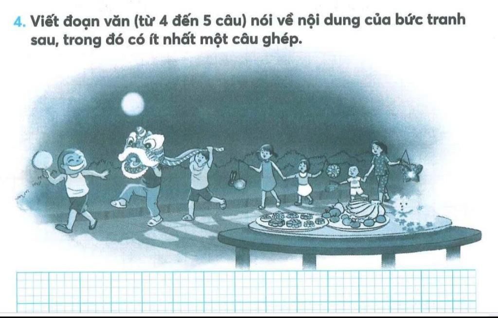 Dưới ánh trăng rằm sáng rực,các bạn nhỏ đang vui vẻ mở hội rước đèn và múa lân.Tiếng trống hội vang lừng hòa cùng tiếng cười nói rộn ràng khắp xóm nhỏ.Trên bàn tiệc,mâm ngũ quả được bày biện đẹp mắt với đủ loại bánh trái thơm ngon.Đám trẻ say sưa nối đuôi nhau thành hàng dài,còn những chiếc lồng đèn hình con thỏ,hình ngôi sao thì tỏa sáng lung linh trong đêm.Tất cả tạo nên một khung cảnh Tết Trung Thu thật ấm áp và đáng nhớ.