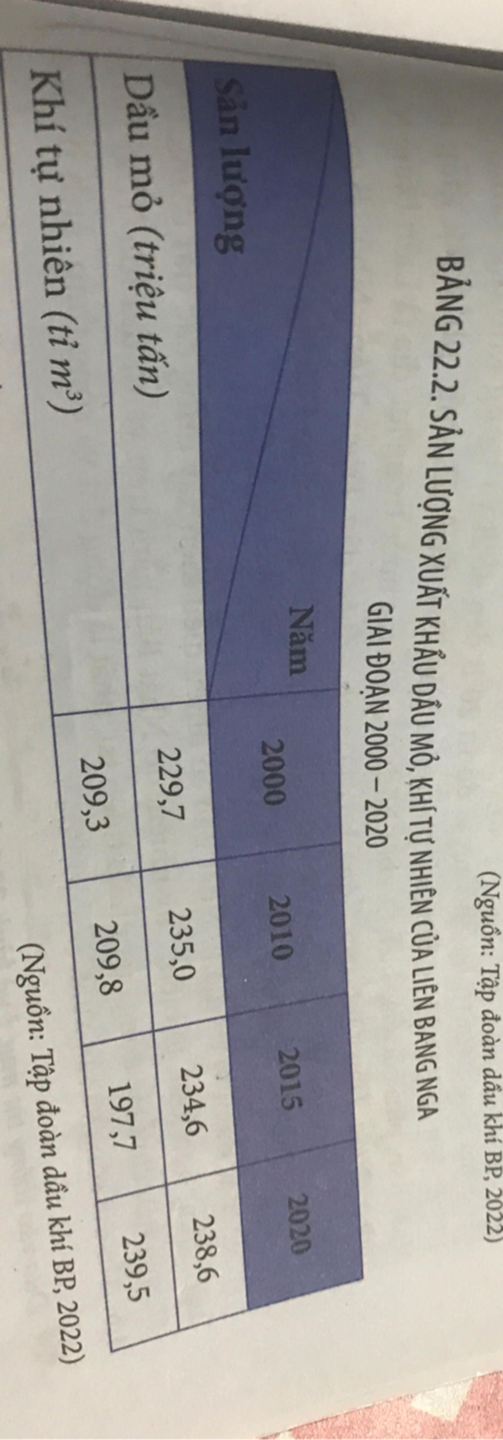 BẢNG 22.2. SẢN LƯỢNG XUẤT KHẨU DẦU MỎ, KHÍ TỰ NHIÊN CỦA LIÊN BANG NGA