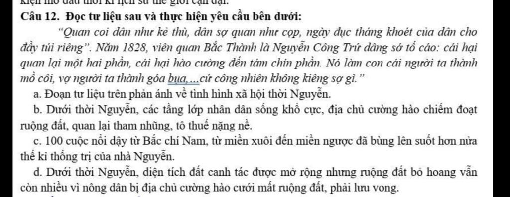 a. Đúng - Đoạn văn phản ánh rõ bộ máy nhà nước mục nát và sự khốn khổ của người dân dưới thời nhà Nguyễn.