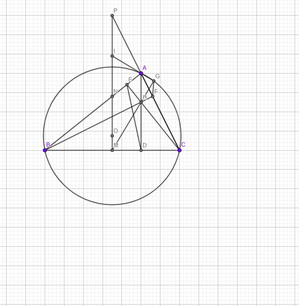 Cho tam giác ABC nhọn (AB > AC) nội tiếp đường tròn (O), các đường cao AD, BE và CF cắt nhau tại H. Qua O kẻ đường thẳng song song với AD, cắt BC, AB, AC lần lượt tại M, N và P.