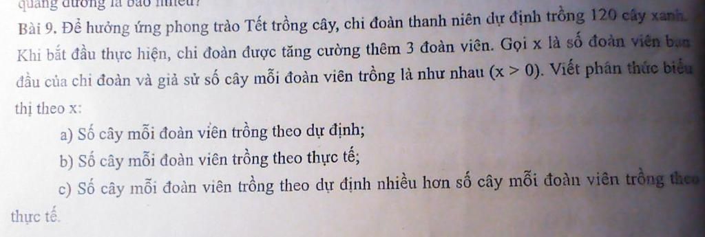 &\text{Phân thức biểu thị số cây mỗi đoàn viên trồng theo thực tế là:} \\