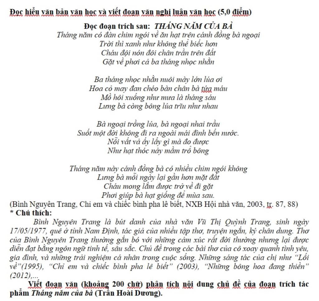 Đọc hiểu văn bản văn học và viết đoạn văn nghị luận văn học (5,0 điểm)