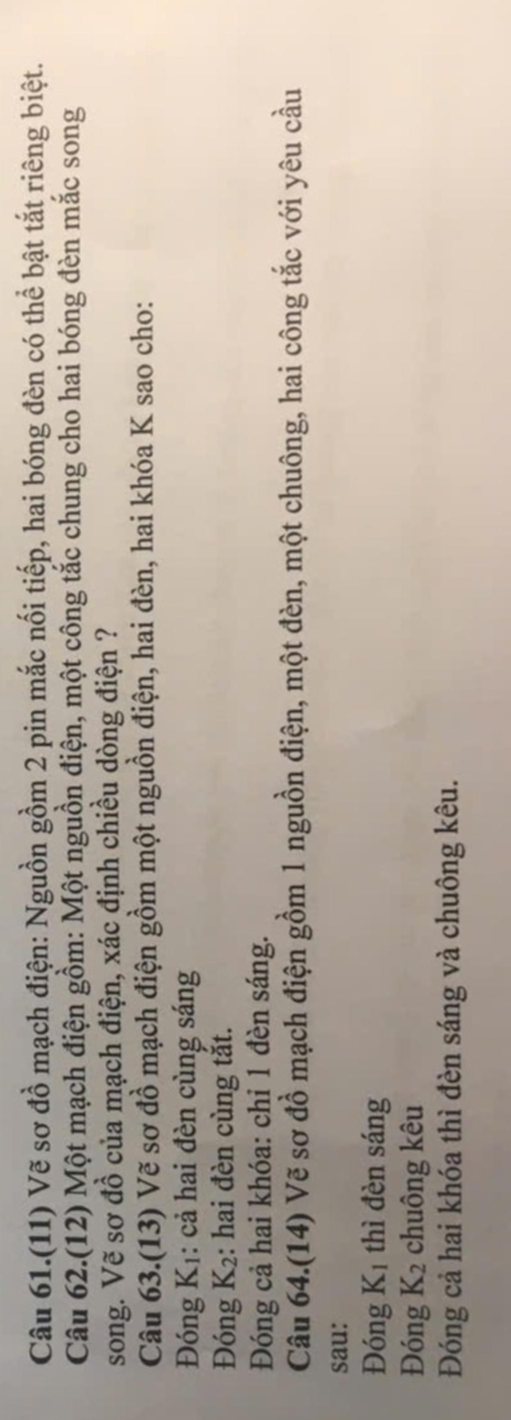 Câu 61.(11) Vẽ sơ đồ mạch điện: Nguồn gồm 2 pin mắc nối tiếp, hai bóng đèn có thể bật tắt riêng biệt.
