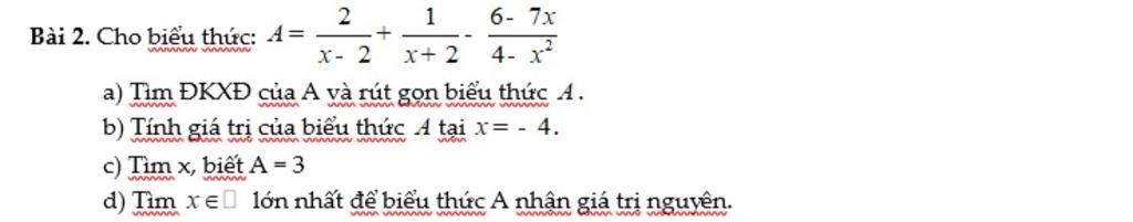 Có: `A=2/(x-2)+1/(x+2)-(6-7x)/(4-x^2)`