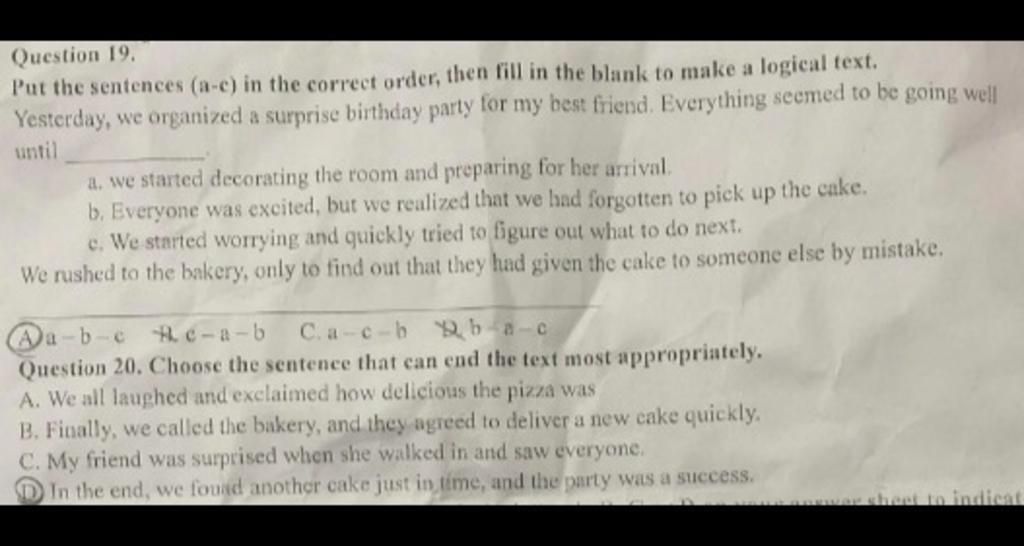 D. tìm được chiếc bánh khác kịp lúc và bữa tiệc diễn ra thành công -> hợp lí nhất