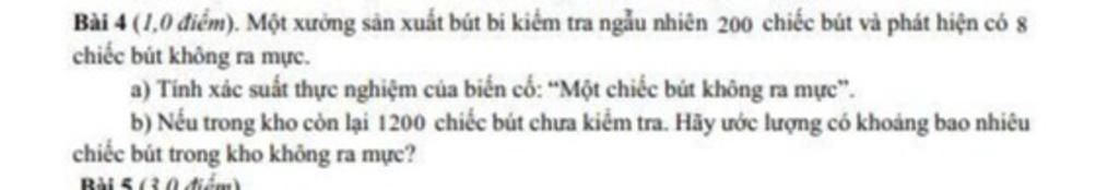 Bài 4 (1,0 điểm). Một xưởng sản xuất bút bi kiểm tra ngẫu nhiên 200 chiếc bút và phát hiện có 8