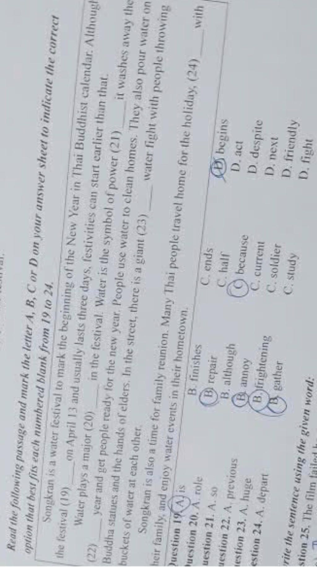 Câu 24: "Many Thai people travel home for the holiday, (24) ______ with their family..."