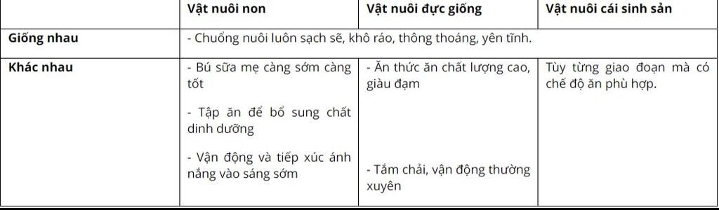 so sánh biện pháp nuôi dưỡng và chăm sóc vật nuôi non,vật nuôi đực dống,vật nuôi sinh sản