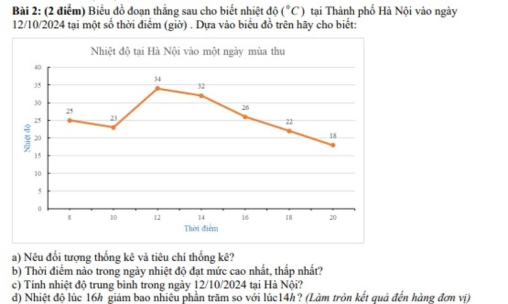 `a)` Đối tượng thống kê: Nhiệt độ tại Thành phố Hà Nội vào ngày `12//10//2024` tại một số thời điểm(`8` giờ, `10` giờ, `12` giờ, `14` giờ, `16` giờ, `18` giờ, `20` giờ)