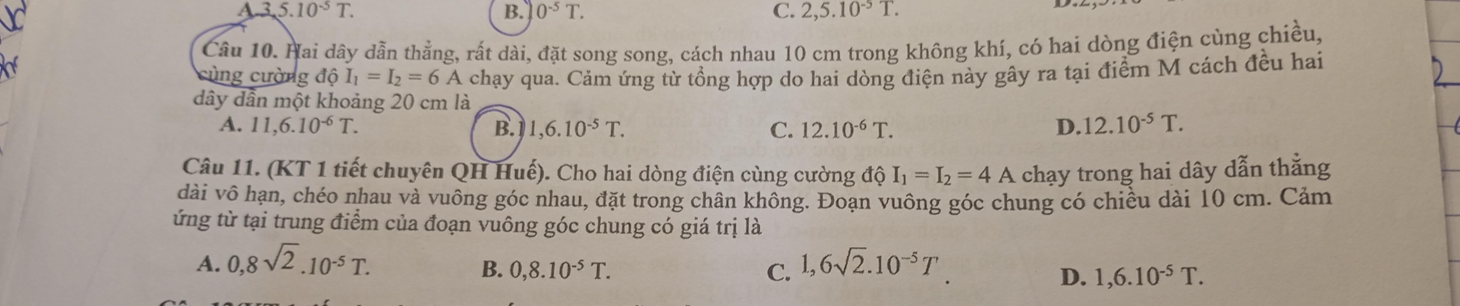Câu 10. Hai dây dẫn thẳng, rất dài, đặt song song, cách nhau 10 cm trong không khí, có hai dòng điện cùng chiều,