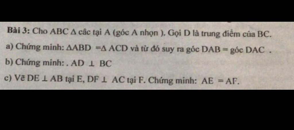 Bài 3: Cho ABC A các tại A (góc A nhọn ). Gọi D là trung điểm của BC.
