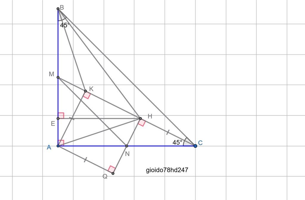 Cho tam giác ABC vuông cân với đáy BC . Gọi M và N lần lượt là trung điểm của AB và AC . Kẻ NH vuông góc với CM tại H . Kẻ HE vuông góc với AB tại E . Kẻ AK vuông góc với CM tại K. Kẻ AQ vuông góc vơi HN tại Q.