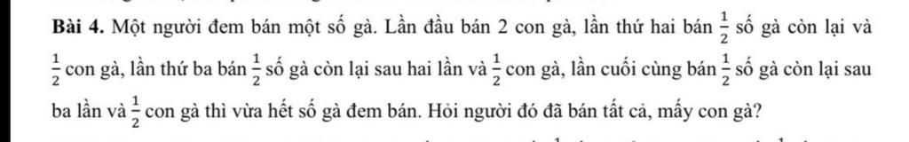 & \text{Số gà còn lại sau lần bán thứ tư (lần cuối cùng) là: } \left[ \dfrac{1}{2} \cdot \left( \dfrac{1}{2} \cdot (x - 2) - \dfrac{1}{2} \right) - \dfrac{1}{2} \right] - \left\{ \dfrac{1}{2} \cdot \left[ \dfrac{1}{2} \cdot \left( \dfrac{1}{2} \cdot (x - 2) - \dfrac{1}{2} \right) - \dfrac{1}{2} \right] + \dfrac{1}{2} \right\} \\