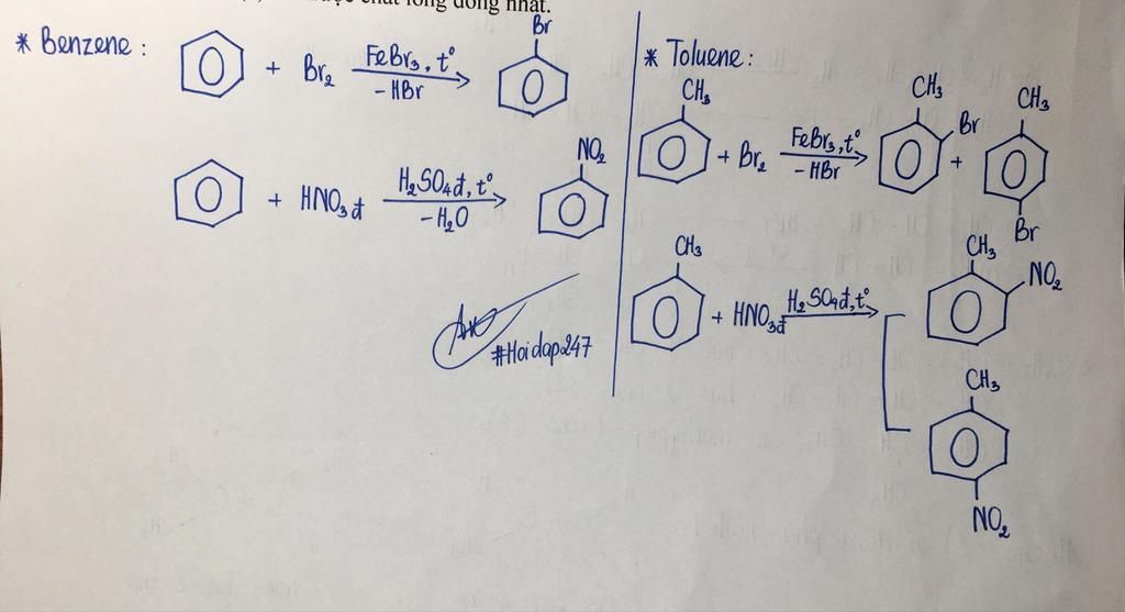 `C_6H_5CH_3 + HNO_3 \overset(H_2SO_4 đặc, t^o)-> o-NO_2C_6H_4CH_3 + H_2O`