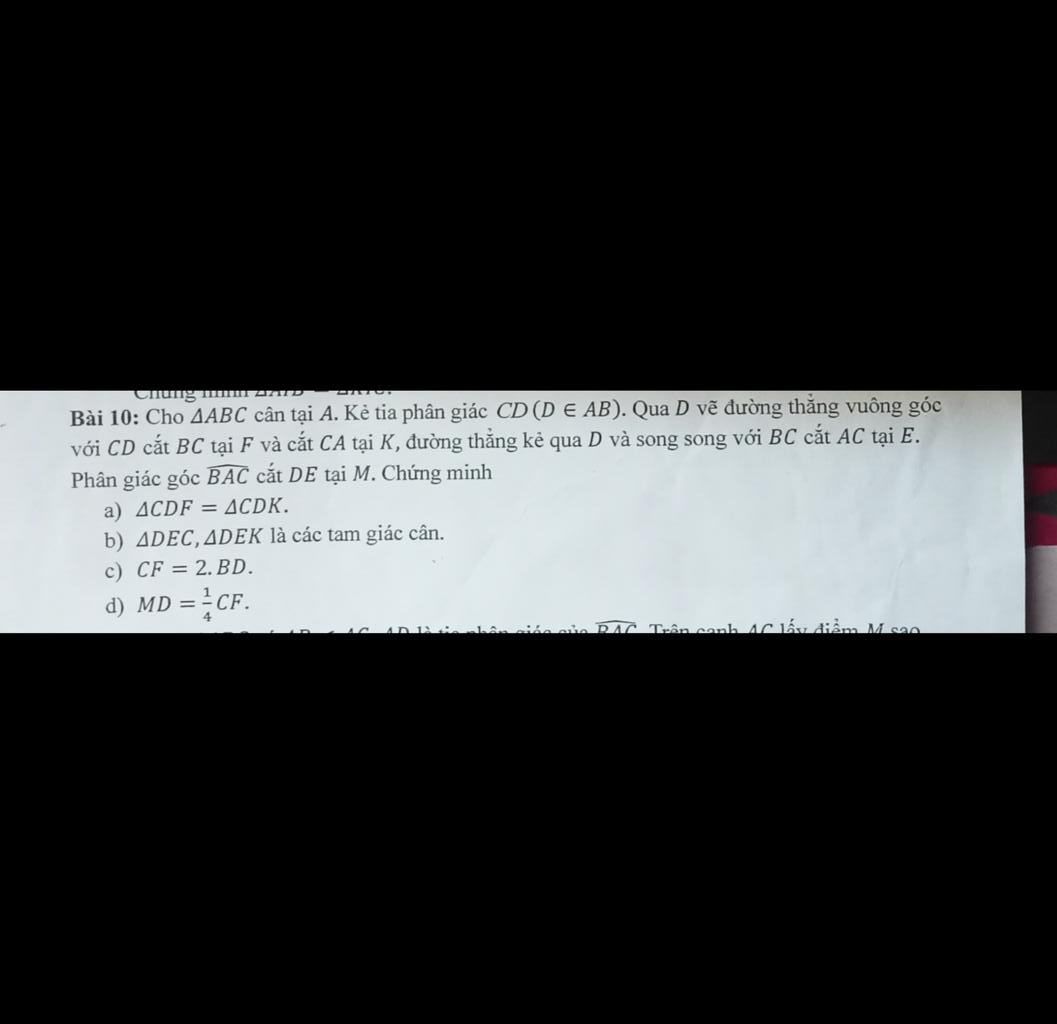 d.Vì $\Delta ADE$ cân tại $A, AM$ là phân giác $\hat A$